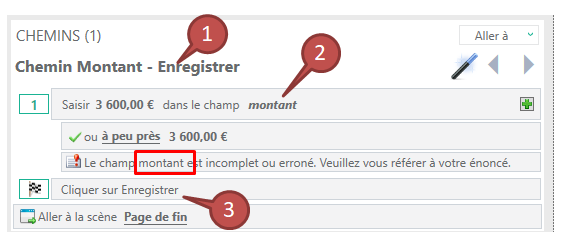 Dans les étapes du chemin, le nom des différents éléments (champs, etc.) peuvent être différents de ceux qui sont visibles dans la scène. Nous vous conseillons de modifier ces noms afin de rendre intelligible votre scénarisation.