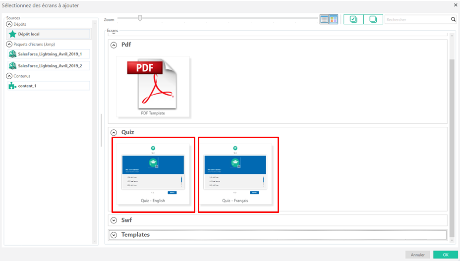 Sélectionnez l'écran de quiz correspondant à la langue souhaité (anglais ou français). Puis cliquez sur OK.
