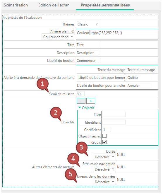 - Indiquez si les erreurs de navigation sont soumises à évaluation. Vous pouvez indiquer, si la variable est requise ou non (caractère facultatif ou non de la variable dans la réussite).