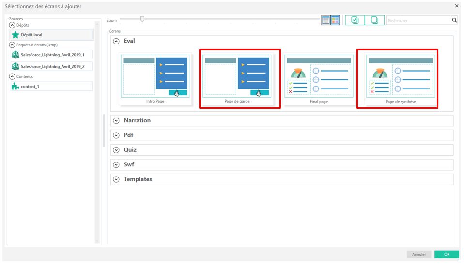 Commencez par accéder à la fenêtre permettant d'insérer des écrans. Sélectionnez l'écran Page de garde et l'écran Page de synthèse correspondant à la langue souhaité (anglais ou français). Puis cliquez sur OK.