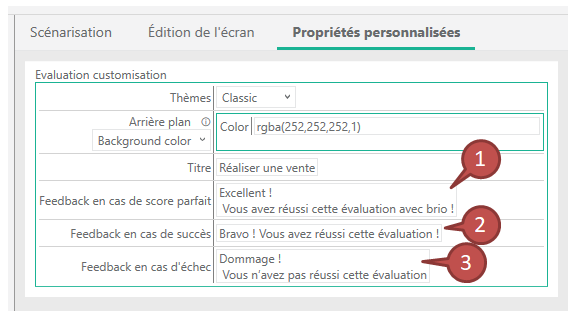 - Indiquer le feedback lorsque le score de l'apprenant > seuil indiqué dans les propriétés personnalisés de la page de garde