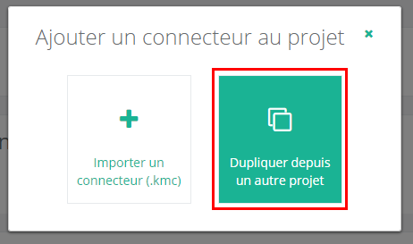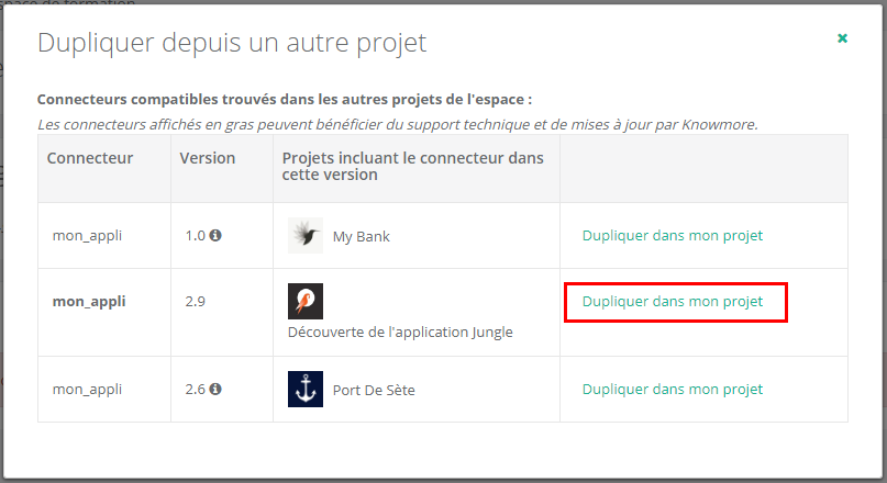 Dans la ligne correspondant au connecteur que vous souhaitez ajouter, cliquez sur le bouton Dupliquer dans mon projet. Si un connecteur est disponible en plusieurs versions, il est fortement recommandé de sélectionner la version la plus récente afin de bénéficier d'éventuelles mises à jour futures.