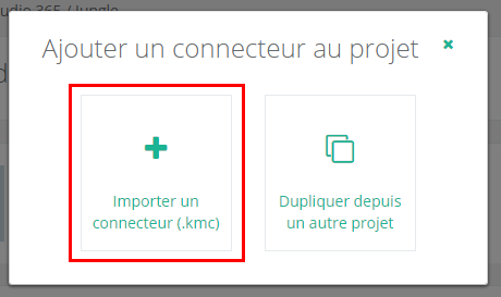 Vous pouvez ajouter un connecteur dans votre projet, soit en insérant le fichier .kmc transmis par Knowmore (recommandé), soit en dupliquant le connecteur d'un autre projet.