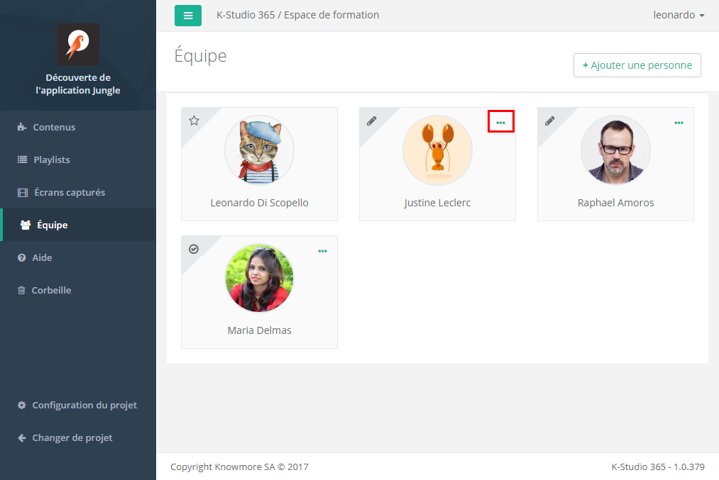 Dans votre projet, sélectionnez l'écran Équipe. Sur la vignette de l'utilisateur dont vous voulez changer le rôle, cliquez sur le bouton à 3 points … dans l'angle haut droite. (Ce bouton apparaît seulement si vous êtes propriétaire du projet.)