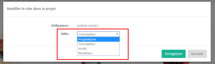 Cliquez sur Enregistrer. La fenêtre se ferme et le nouveau rôle est attribué à l'utilisateur. L'accès à plus ou moins de fonctions (selon le nouveau rôle attribué) sera instantané pour l'utilisateur de votre projet.