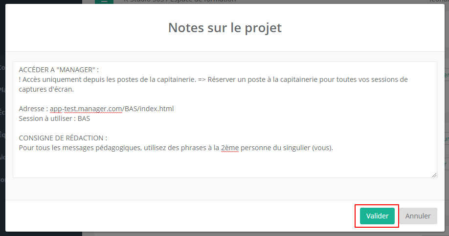 Dans la fenêtre Notes sur le projet, dans le champ texte, entrez le texte souhaité. Puis cliquez sur Valider.