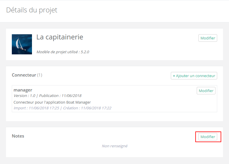 Dans l'écran Détails du projet (accessible au clic sur l'image du projet), dans la section Notes, cliquez sur Modifier.