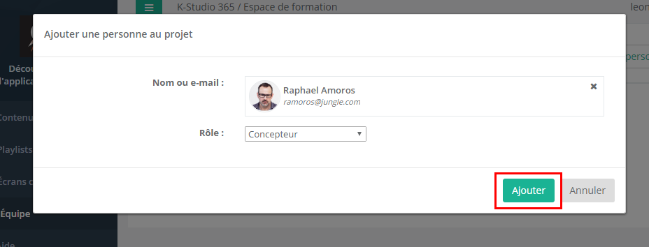 Vous pouvez inviter des personnes autorisées à se connecter à votre espace K-Studio, à accéder à votre projet. Seules les personnes que vous autoriserez verront votre projet dans leur écran Projets.